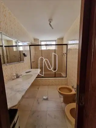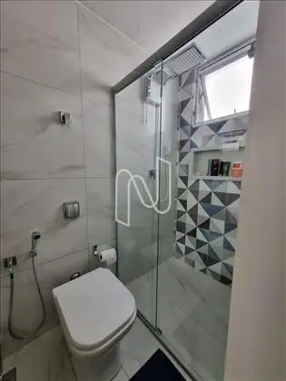Banho Social: Com piso e parede em cerâmica, banheira, box em vidro.
