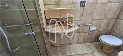 O banho social também é revestido em cerâmica e conta com box em vidro temperado.